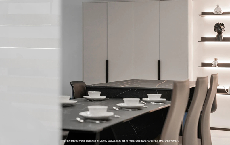 餐邊柜線條簡約利落,在黑色大理石紋餐桌的襯托下顯得尤為清新優雅。