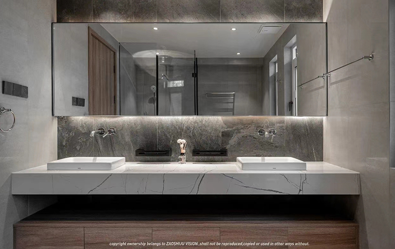 衛浴室簡約實用,大理石紋和木紋是柔與硬的無聲碰撞。