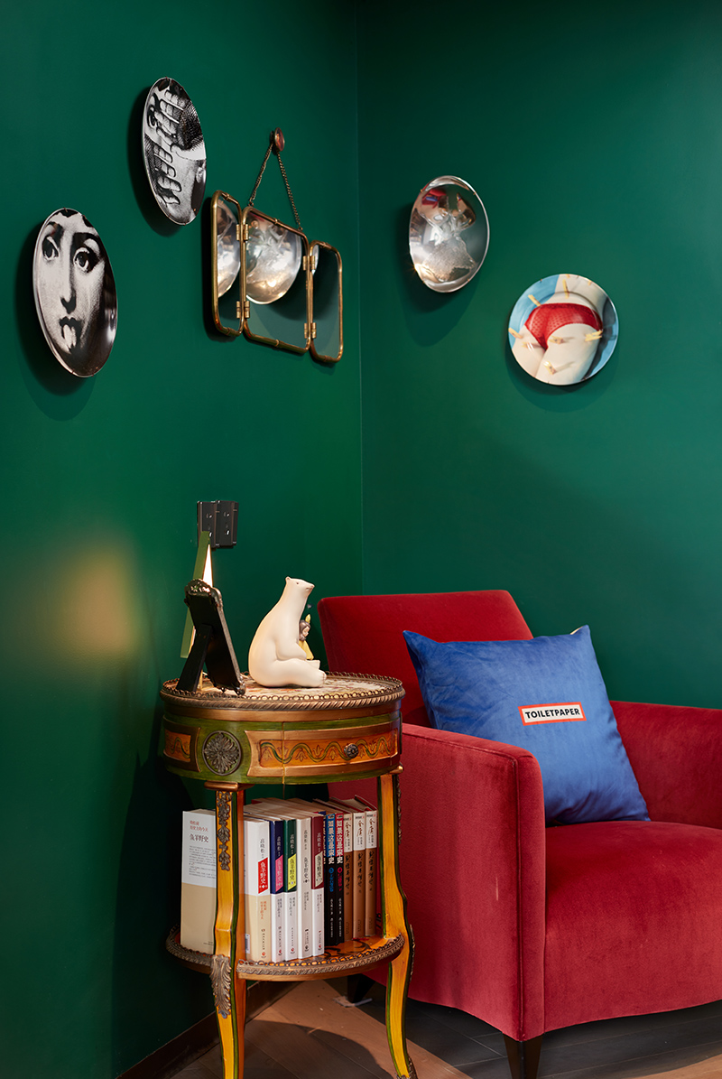 灰色墻面作為打底,點綴濃郁的紅綠黃三色,