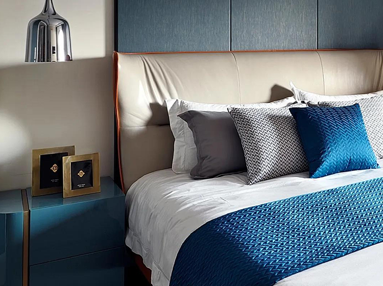 藍色能輕松應用于多種不同的材質、紋理及表面效果上,既能表達傳統與優雅,也能給人帶來大膽的驚喜。拉絲紋理護墻就體現了不規則的光澤,讓整面護墻充滿靈動氣息。床體鑲邊的明艷橙色,裝飾品高貴的藍絲絨,都給居住者以安全感,為心靈帶來平和與寧靜,提供庇護。
