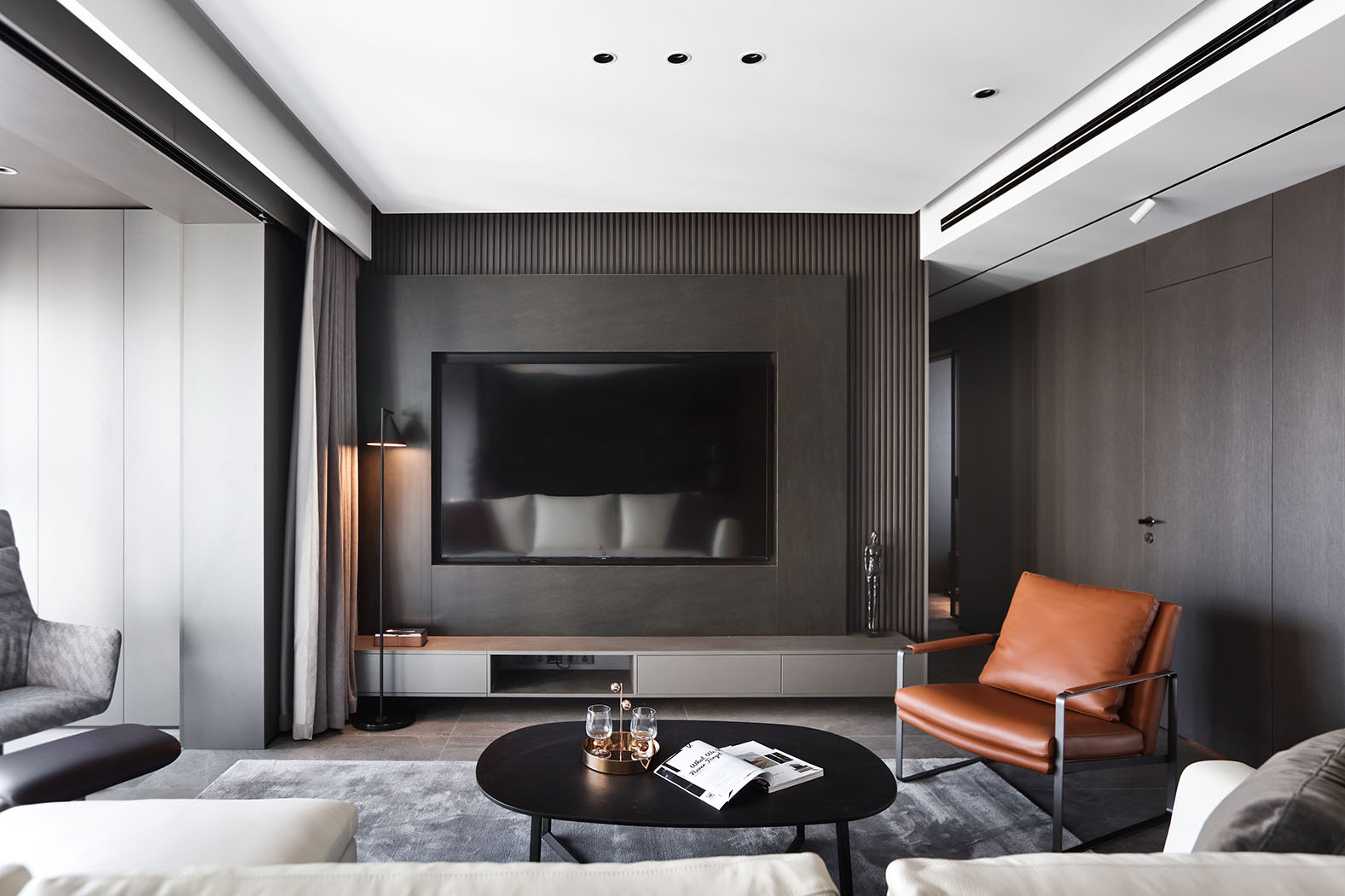 設(shè)計師用格柵豐富電視背景墻的造型,具有設(shè)計感,