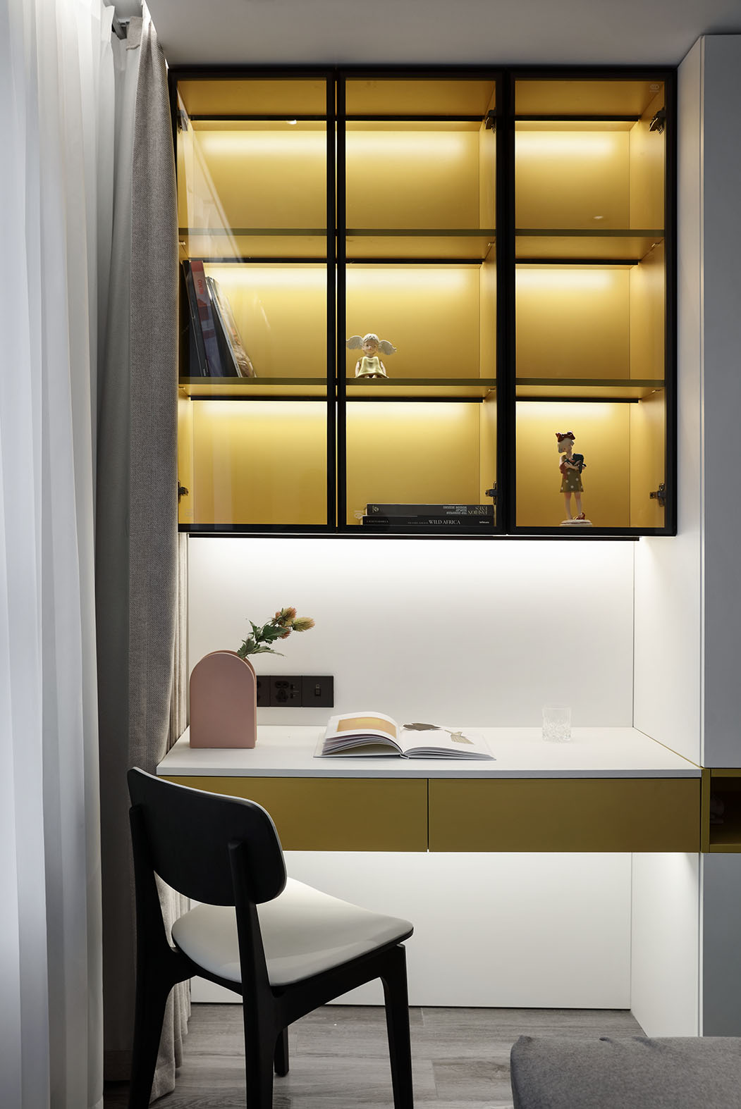 沒有過度的裝飾,只清爽的白色衣柜、活潑的黃色壁掛式書柜、墻面的鋁層板裝飾,