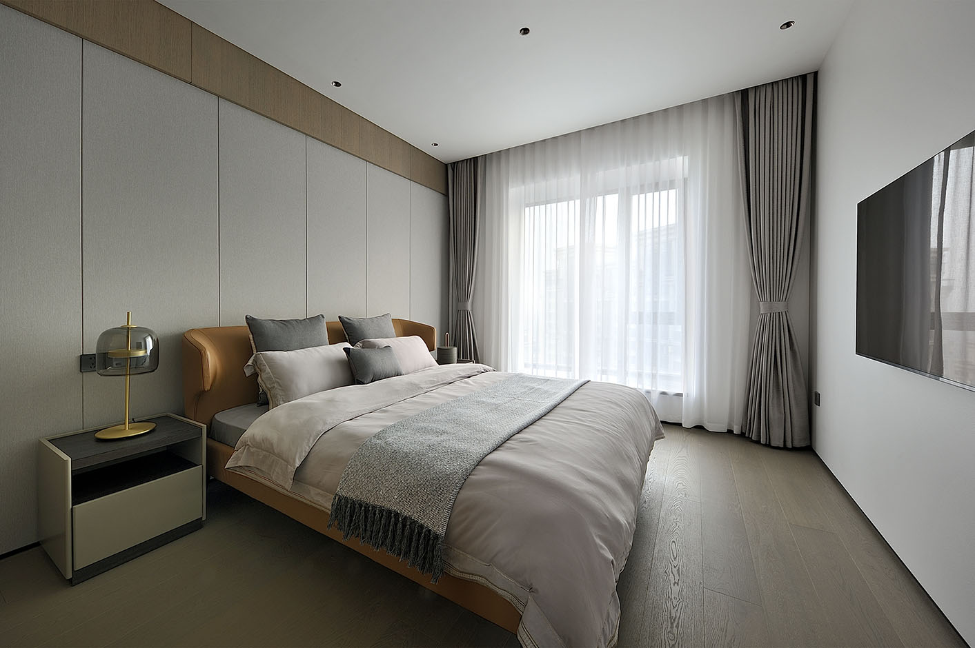 遵循給主人優質睡眠質量的設計主旨,臥室的設計籠罩著淡淡“夕陽”的色調,