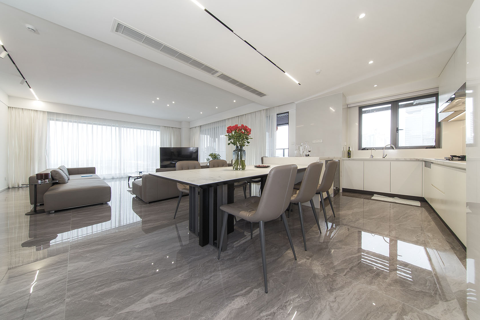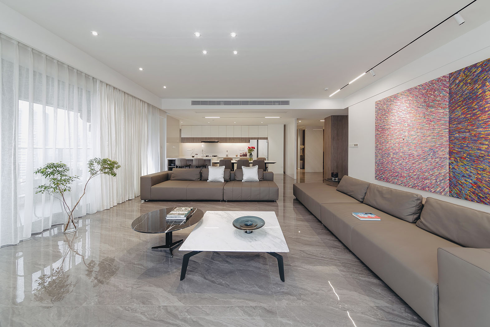 本案將客廳、餐廳、廚房全部打通,從進(jìn)門即能一眼驚艷。