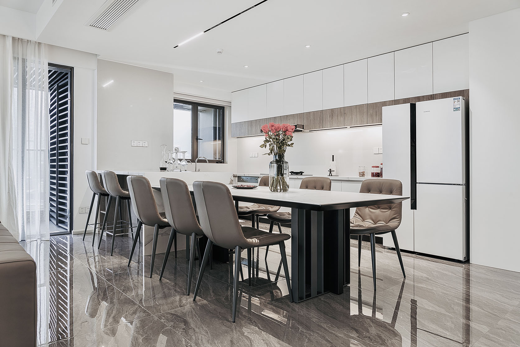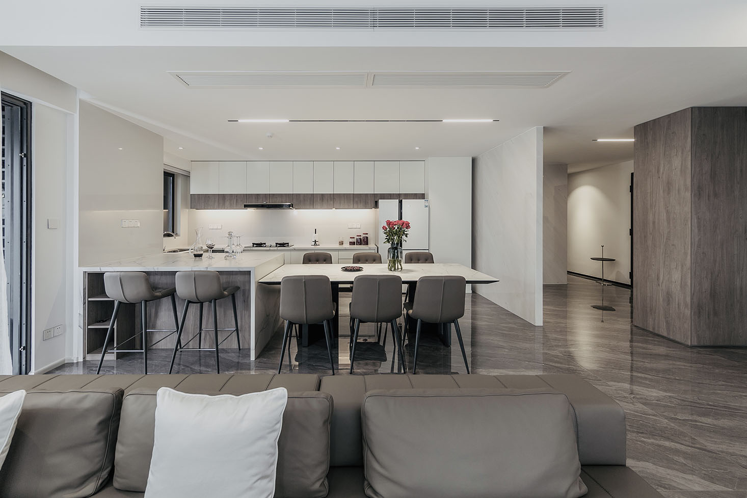 灰花白大理石紋的西廚島臺和灰色皮質(zhì)餐桌椅相互映襯,展開在石影木色中,