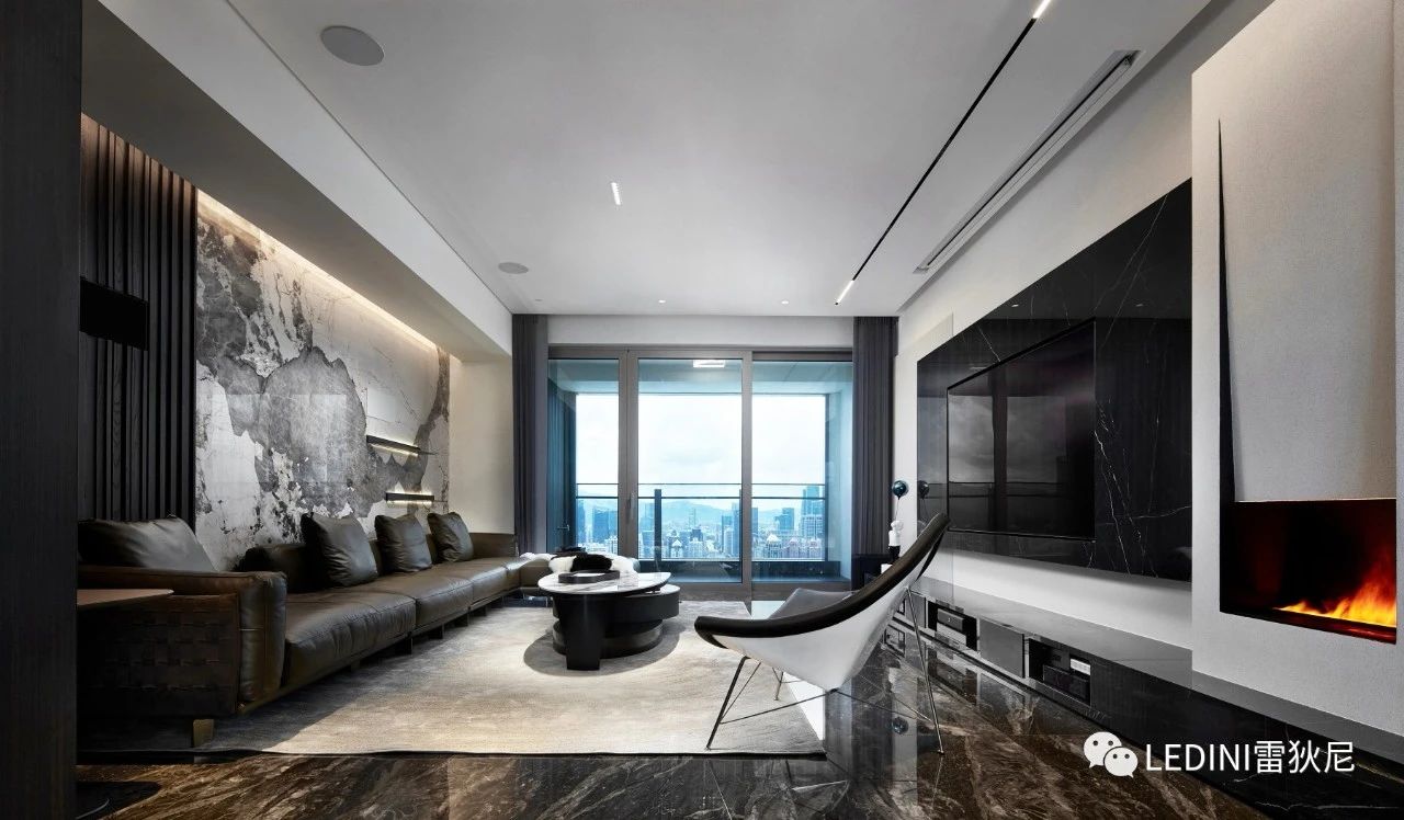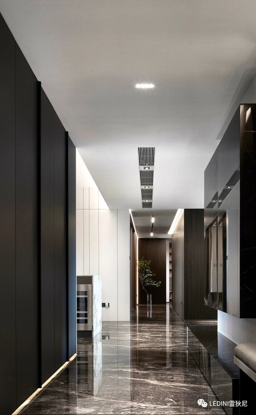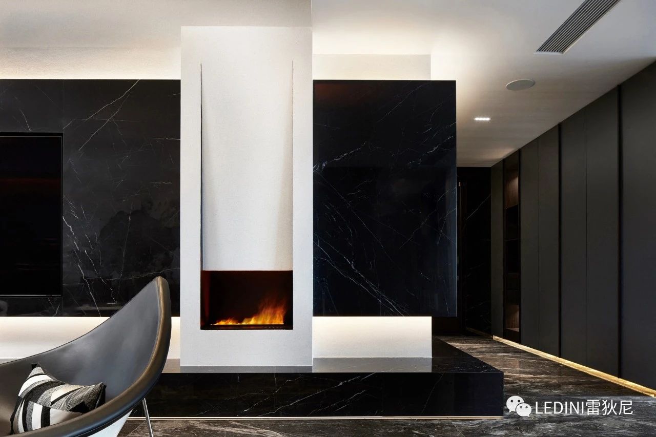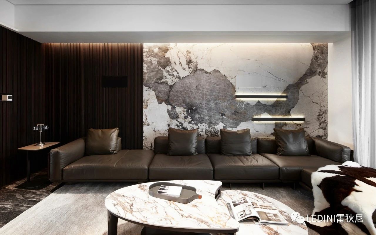 本案主要采用了LEDINI進口煙熏橡木木皮+大理石,以白色為基調,穿插黑色和淺灰色,用現代設計語言打造了一個奢華、剛硬、低調而舒適的紳士空間。