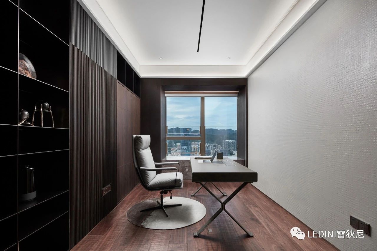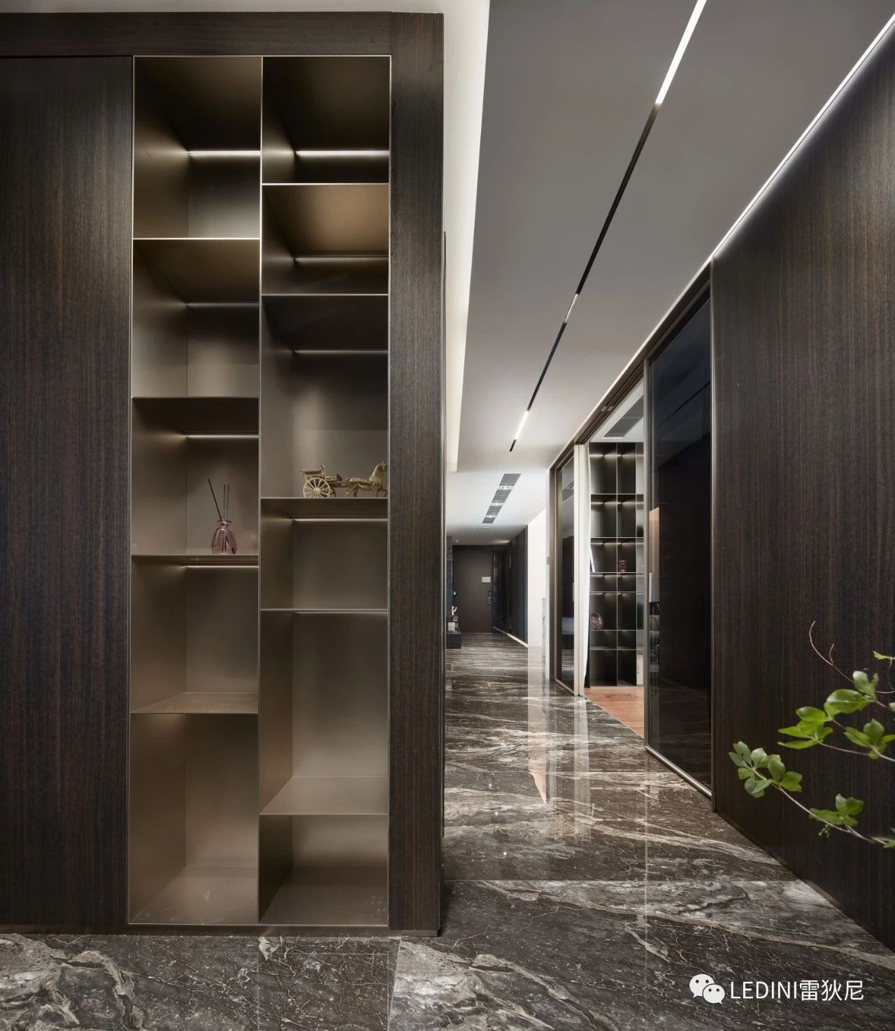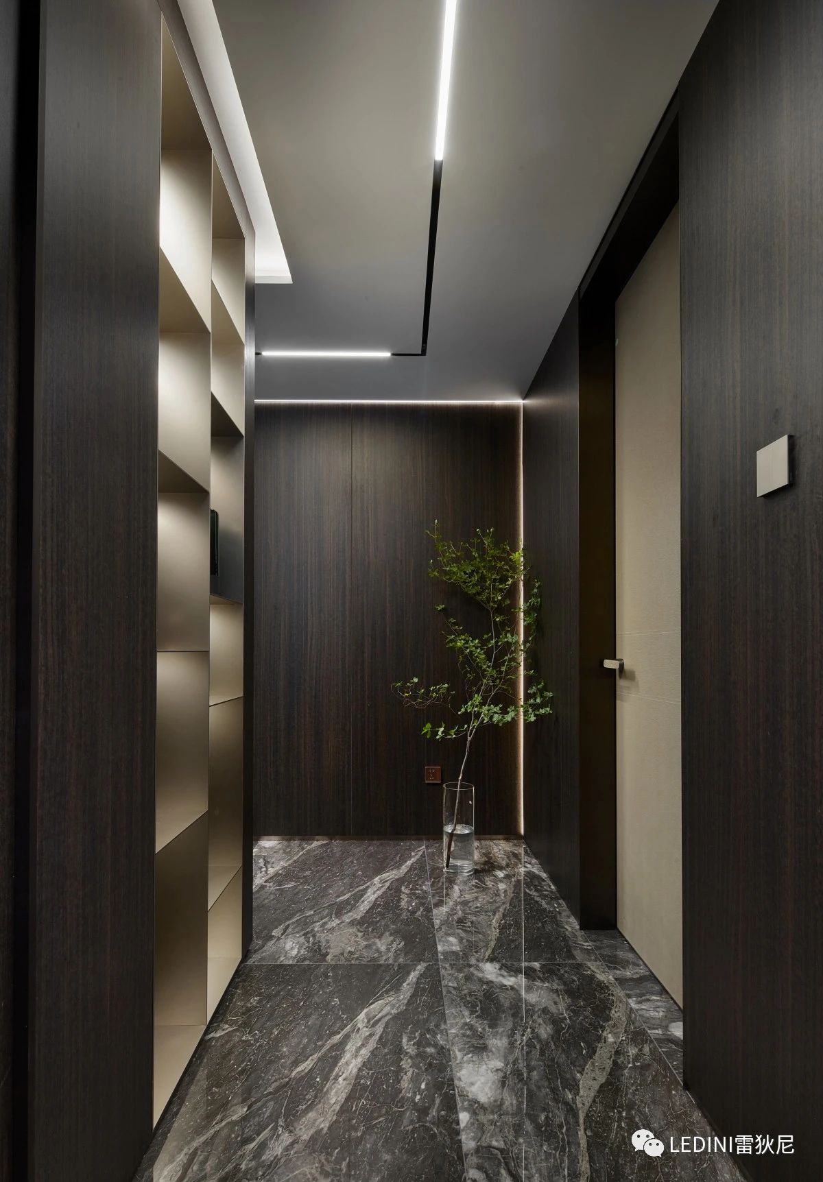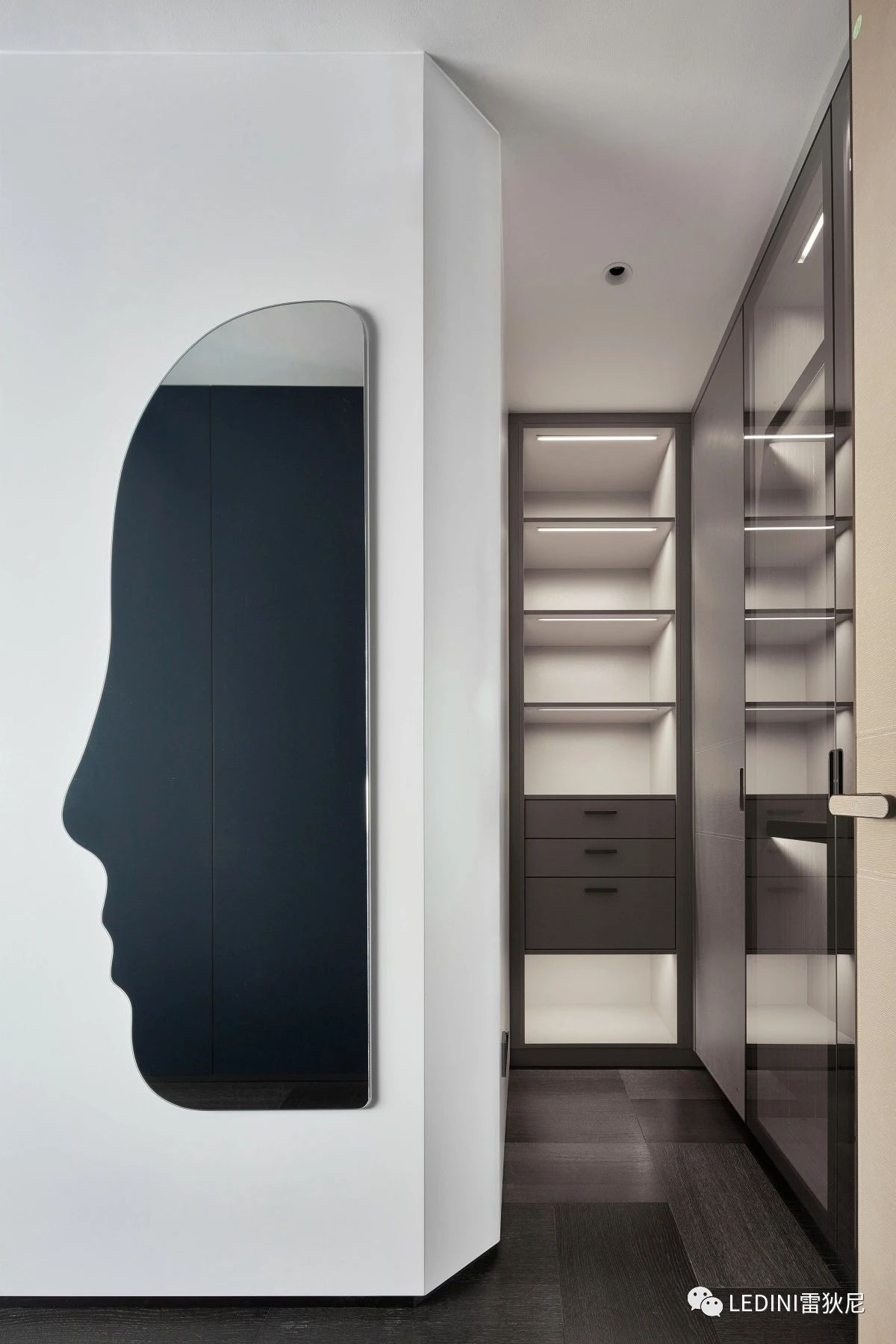 本案主要采用了LEDINI進口煙熏橡木木皮+大理石,以白色為基調,穿插黑色和淺灰色,用現代設計語言打造了一個奢華、剛硬、低調而舒適的紳士空間。