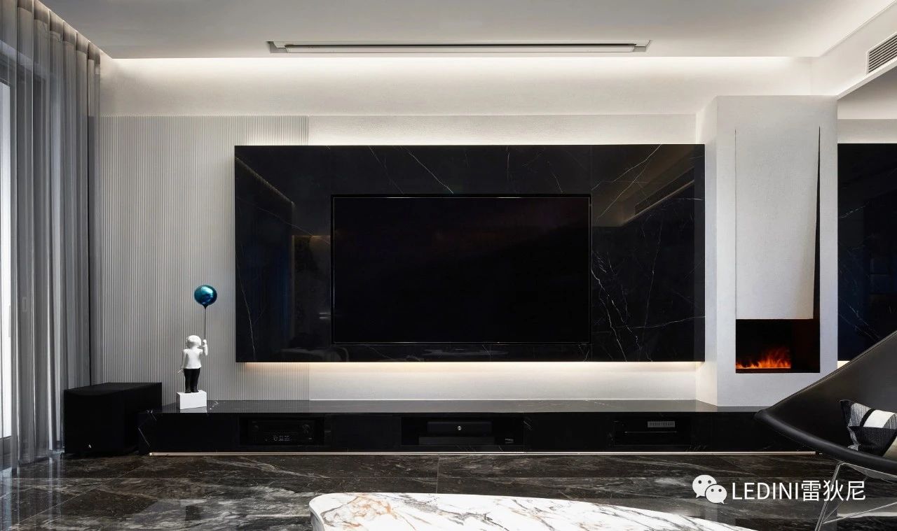 白色格柵電視背景墻素雅質樸,與黑色石紋形成強烈對比,冷峻中帶有一絲清新。