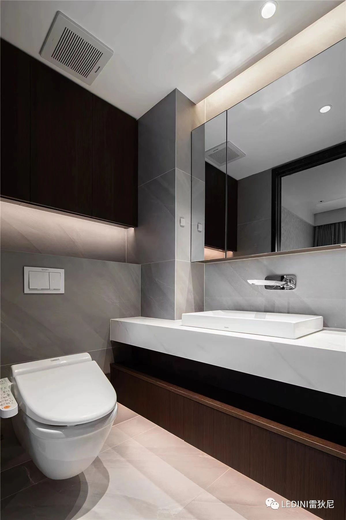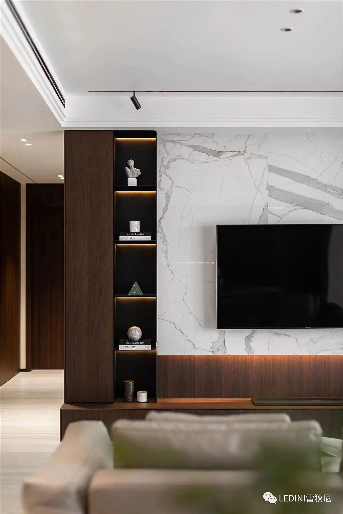 本案中,設(shè)計(jì)師選用了LEDINI進(jìn)口煙熏橡木木皮為主要元素,