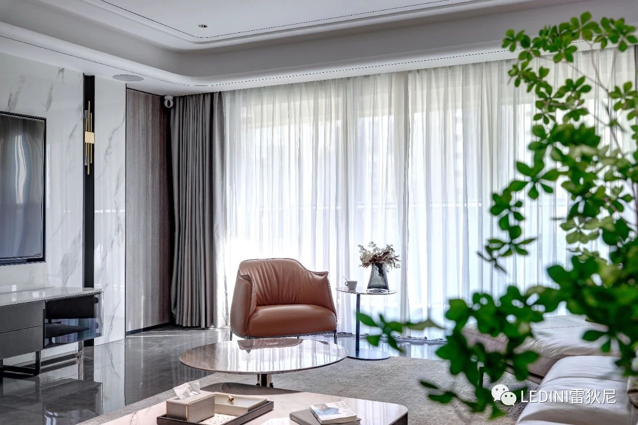 淺灰的皮質(zhì)沙發(fā)搭配棕色沙發(fā)椅,點亮視覺層次;