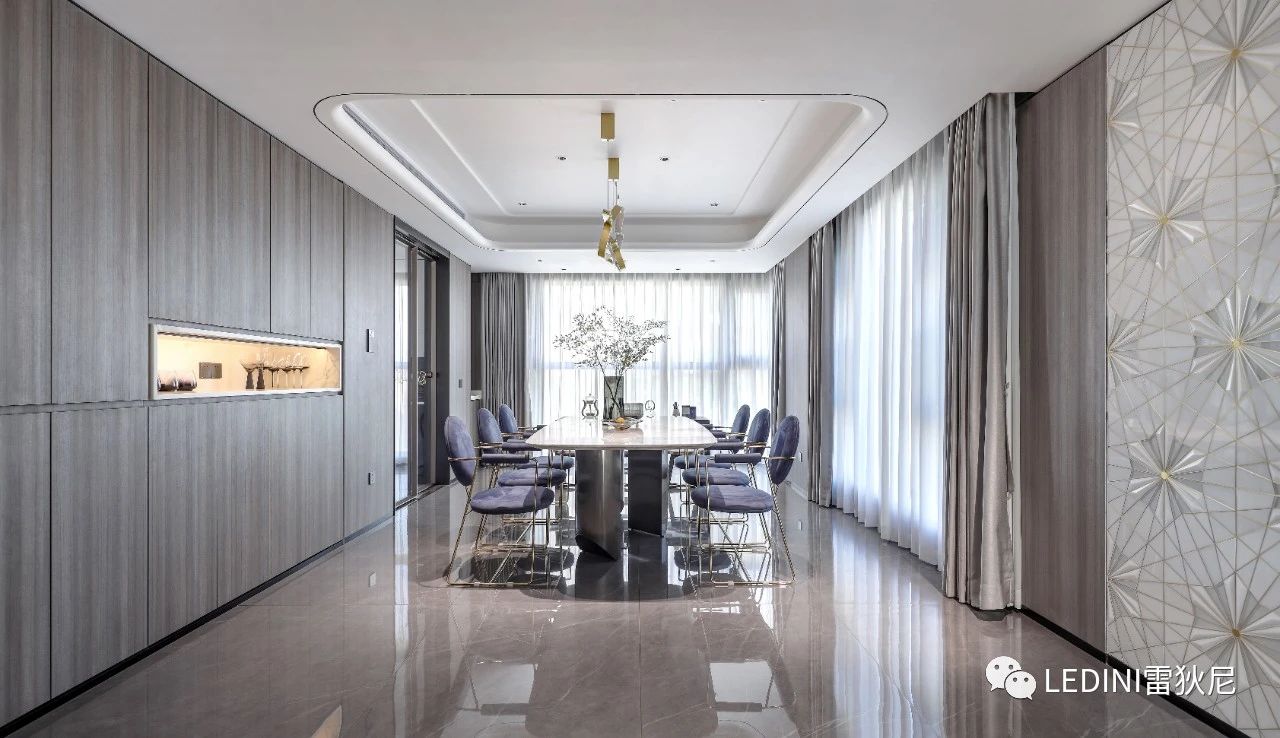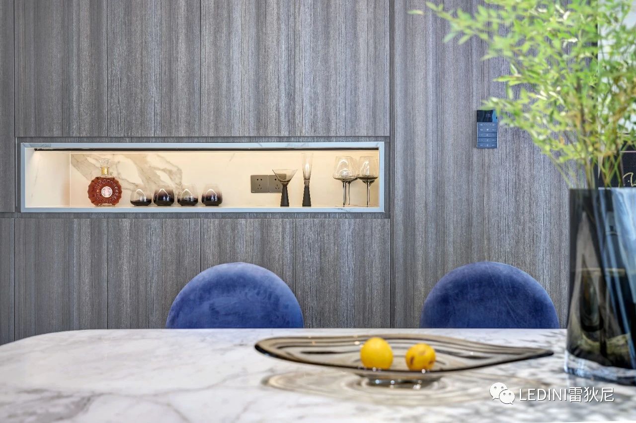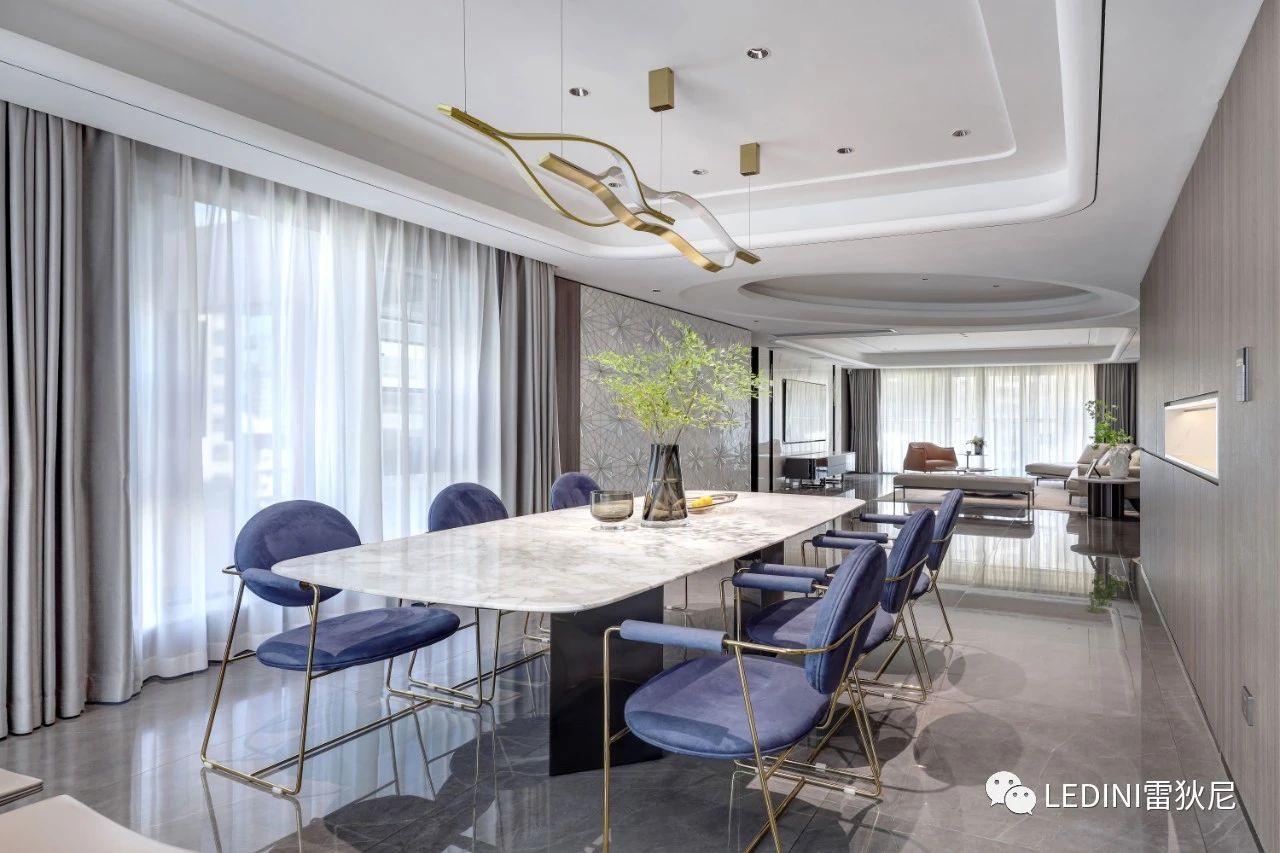 以灰色為主,搭配藍色布藝餐椅,優(yōu)雅舒適,讓用餐氛圍更加輕松。