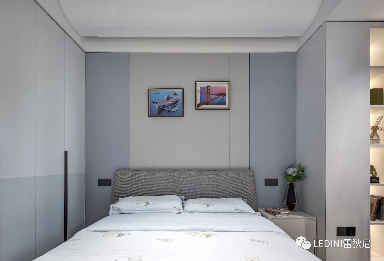 淡淡的藍白拼接烤漆背景墻+舒適的布藝床品,