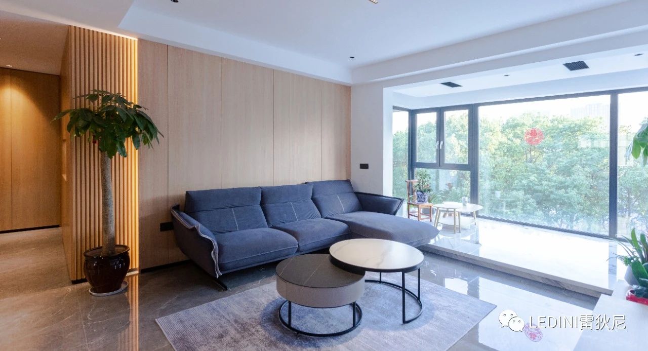 原木色與灰藍(lán)色沙發(fā)呼應(yīng),更顯協(xié)調(diào)。