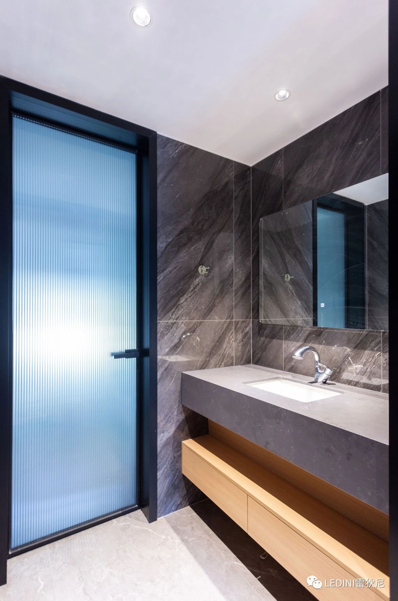 原木元素也存在于洗漱臺,木紋理與大理石紋的經(jīng)典搭配質(zhì)感滿滿,