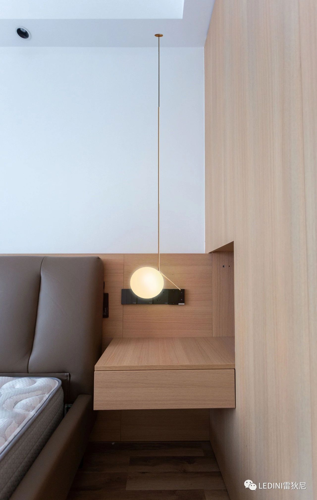 以原木色為基調(diào),簡潔的衣柜,懸空的邊柜,