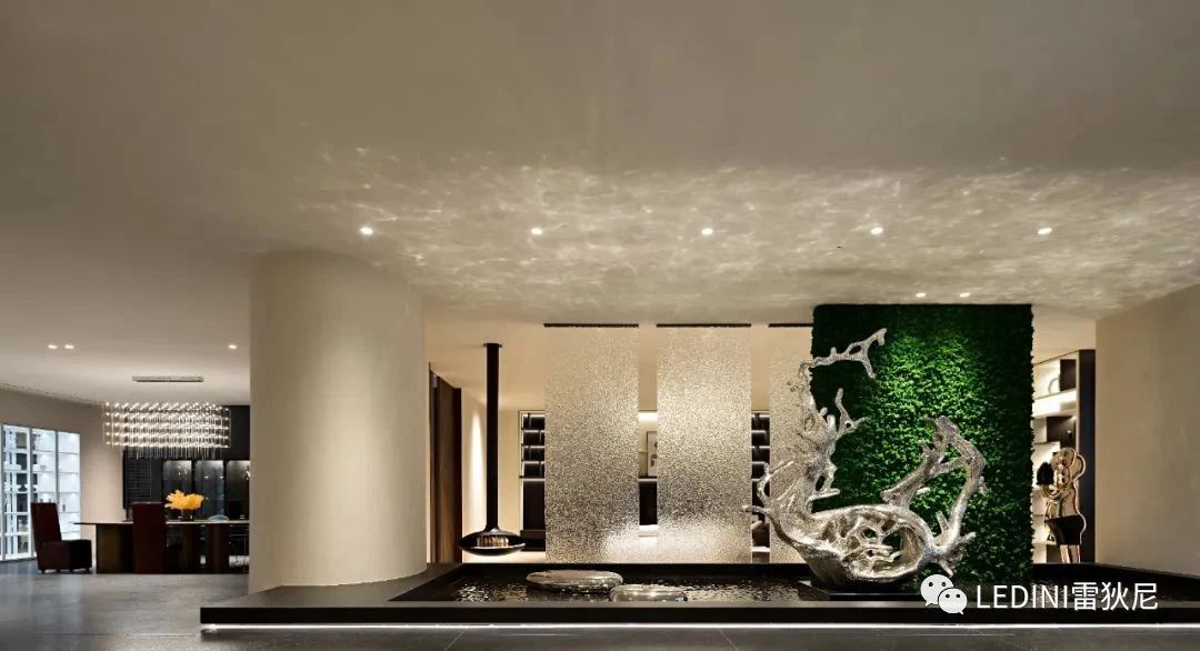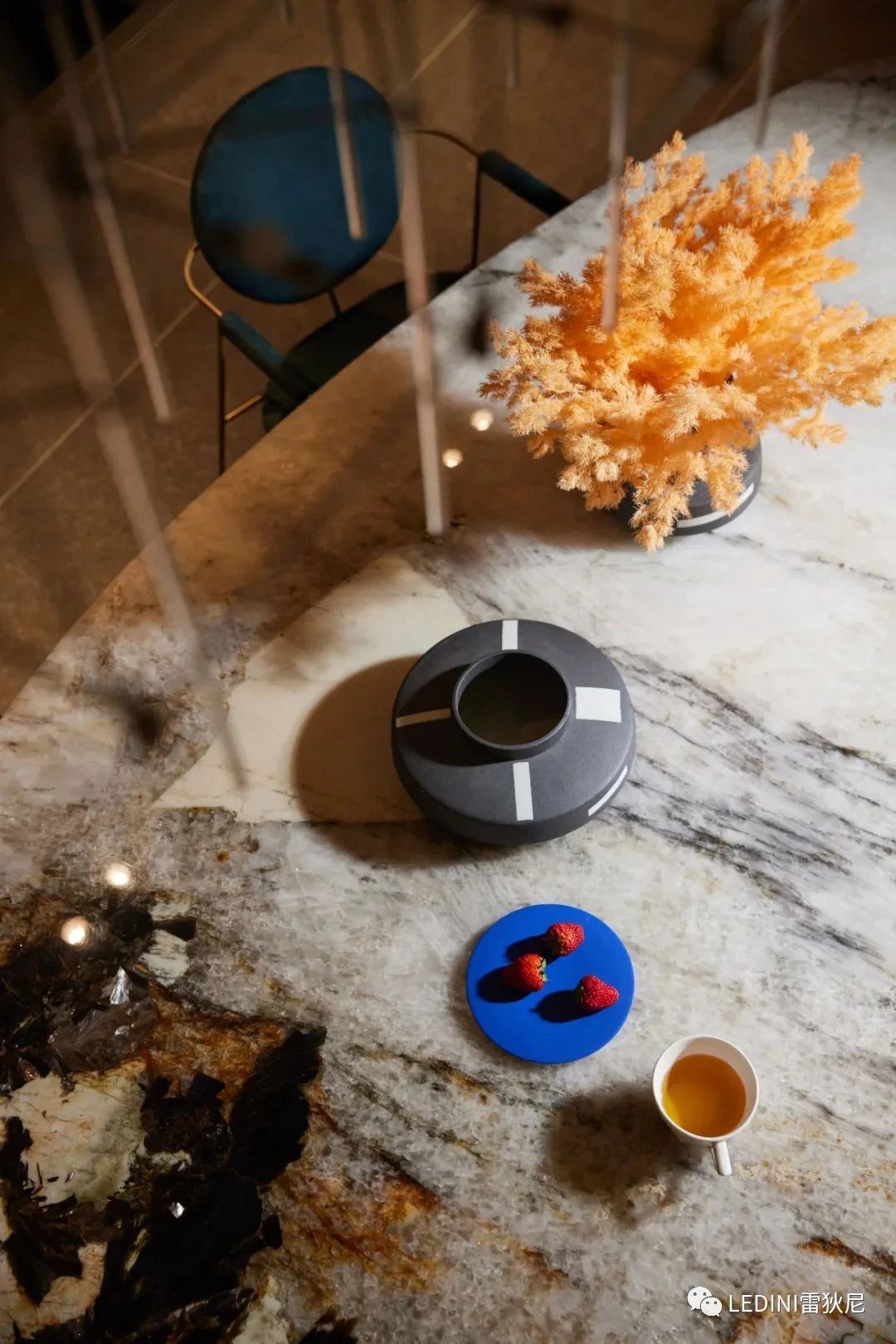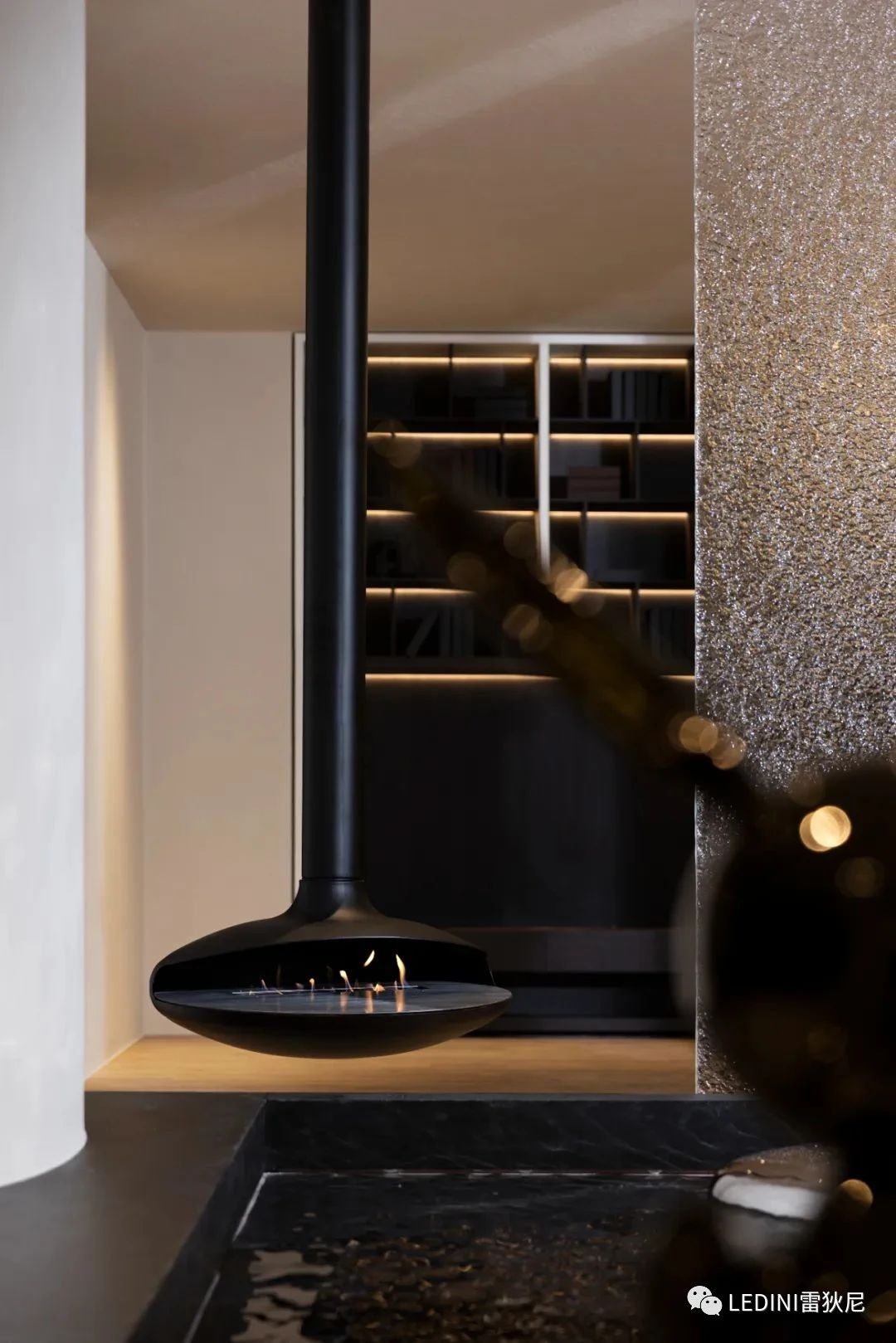 銀色金屬和黑色大理石兩種材質注入水紋肌理將上下界面關聯,