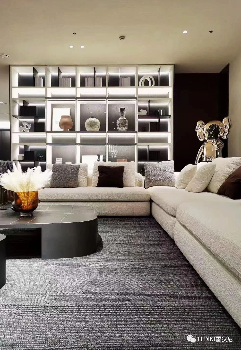 橫向延展的白色布藝沙發營造視覺沖擊,