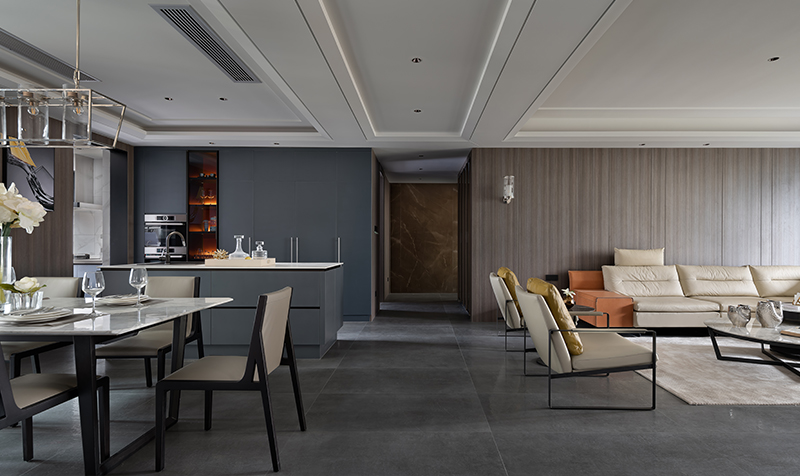還原大自然色系的色彩會給人帶來愉悅的感官體驗,經典的大地色系也能輕松的打造出居住環境的高級感。深灰色櫥柜板與玄關同色系的木紋色護墻把開放空間完美的分為西廚與客廳兩個部分,看似同處于一個空間卻各司其職,又不會分割的太過生硬。