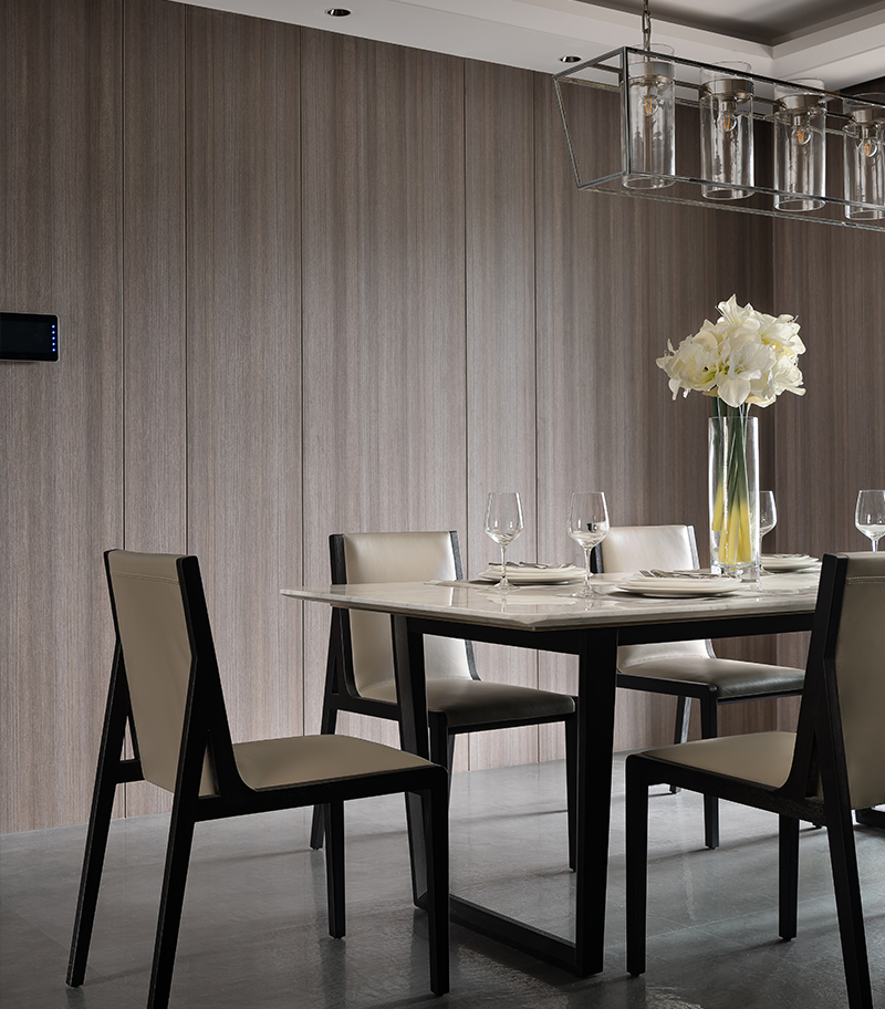 餐廳整體色調更加統一一些,柔和的護墻板木紋顯得餐廳更加的溫馨,更加富有變化,陽光從窗口照射進來,配合金屬與玻璃材質的燈,更加凸顯沉穩的氣質。