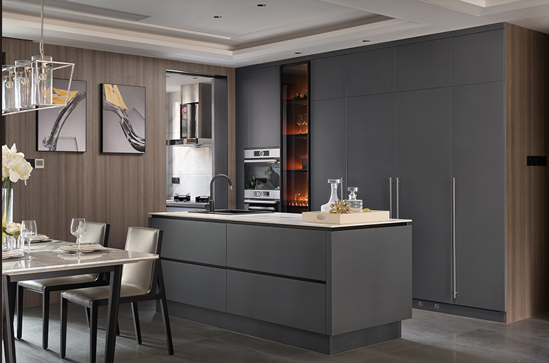 西廚櫥柜選用深灰色板,與其他空間分為冷暖色調,展示柜處配合橙色板與玻璃門板搭配,與客廳色調聯系在一起,具有輕奢質感和時尚氣息,高低飽和度的色彩極與極的碰撞,極冷與極暖的對比,更加的體現出色彩的高級感。