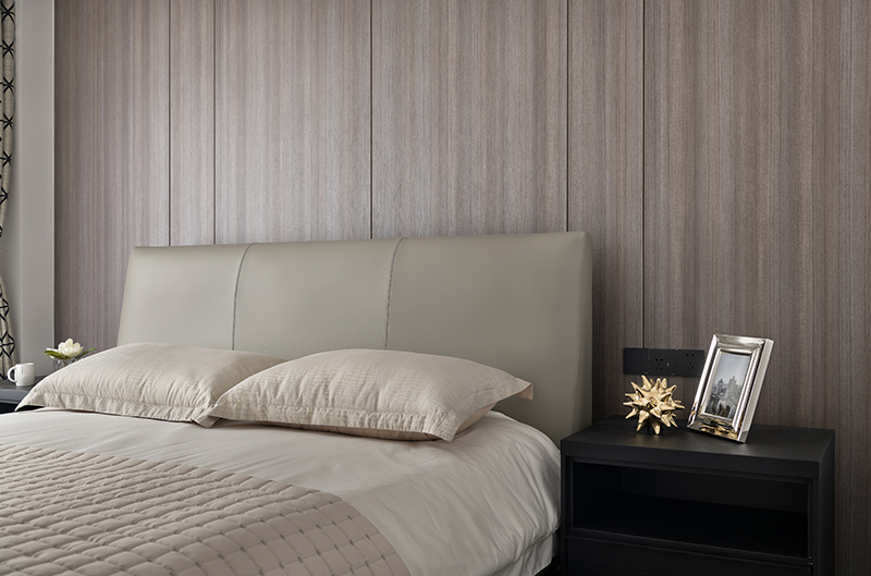 次臥則采用現代風格家具與淺色木紋護墻搭配,深色床頭柜起到點綴作用。