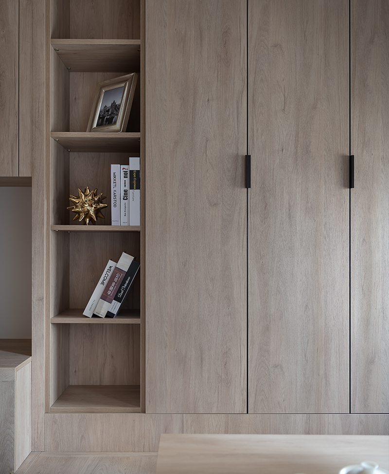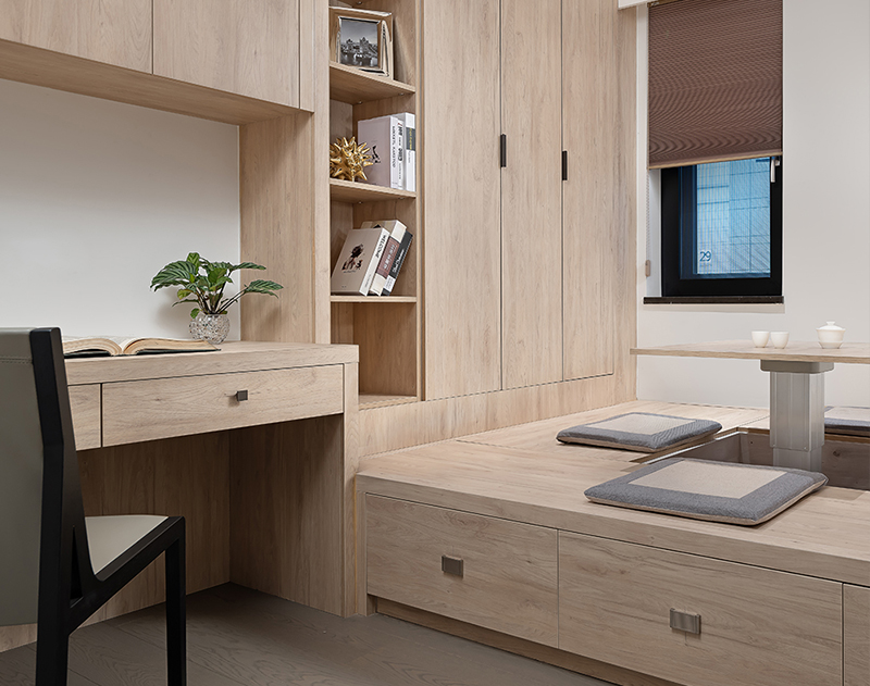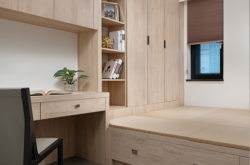書房淺色木紋的榻榻米與書柜書桌一體,空間更具有統一性。淺色的柜體最大限度利用的采光,讓空間更明亮。榻榻米的設置讓房屋的置物率大大提升。