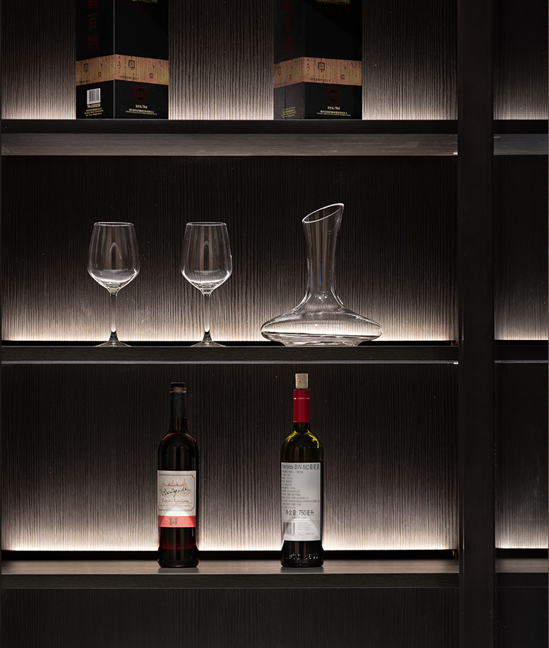 酒柜隱蔽燈光使得酒柜更加具有高級感,深色柜體與玻璃門板的搭配減少了深色的壓迫感,增加了走廊的通透性。