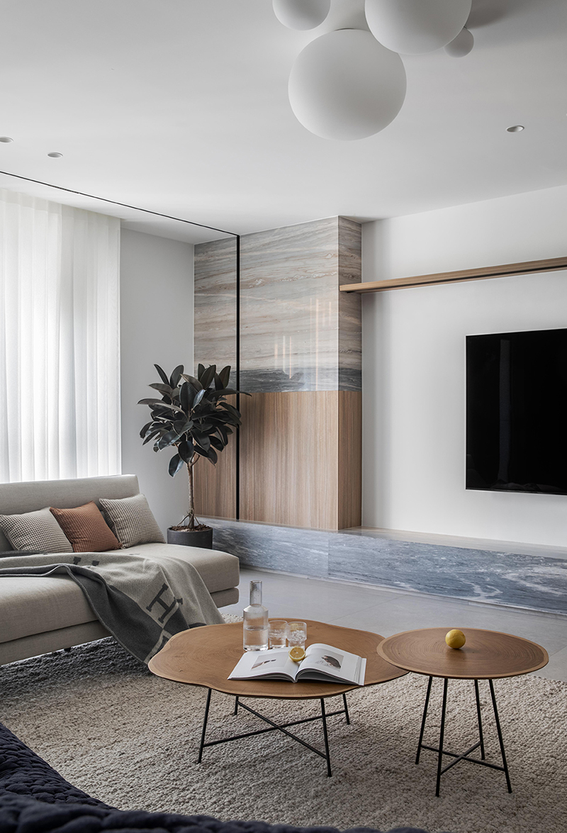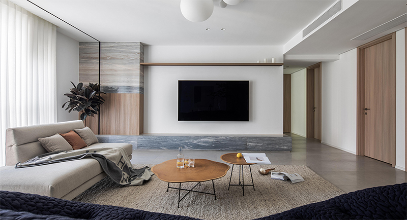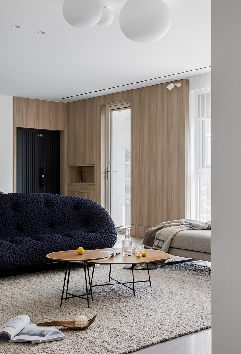 木紋護墻、米白色沙發平和舒緩,將自然氣息引入家中;