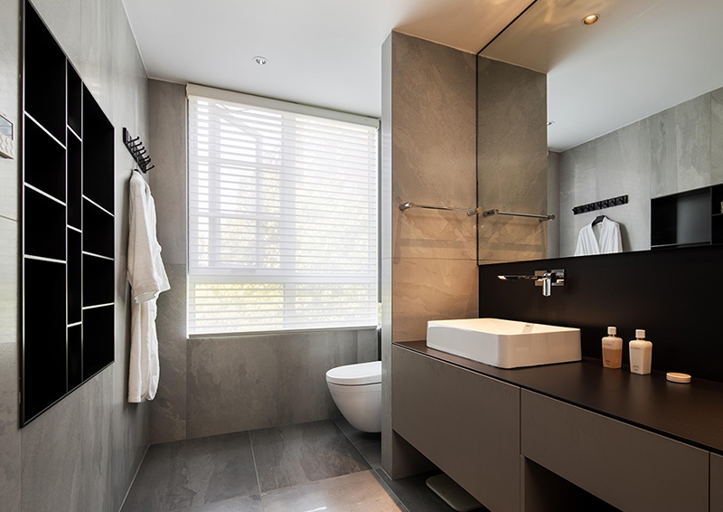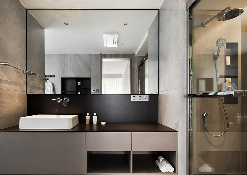 墻壁嵌入深色壁龕與衛浴柜呼應,