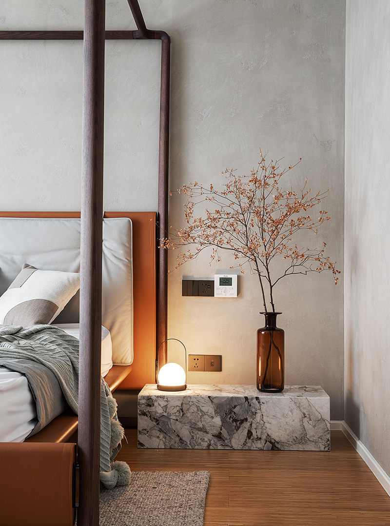 大理石紋的床頭柜和個(gè)性的床前燈,
